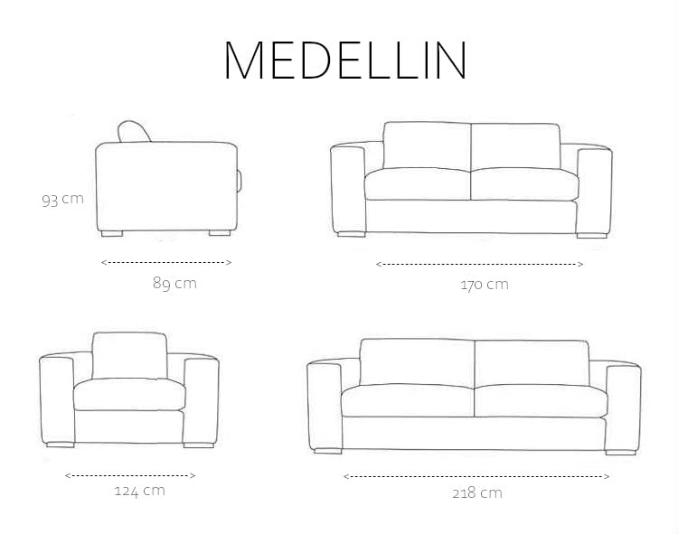 Las medidas varían según el sofá, love seat o sillón; cada uno tiene especificaciones detalladas.
